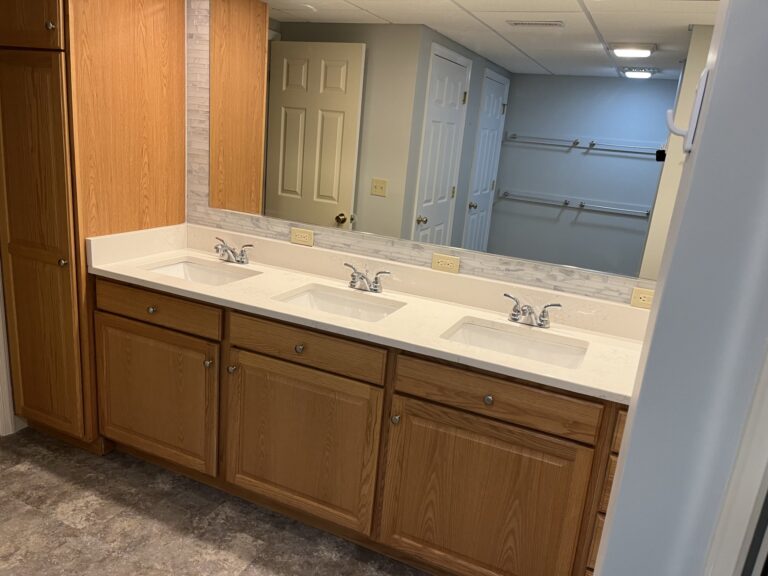 - Bathroom includes quartz vanity top, tile backsplash, 3 sinks, 2 showers, and 2 toilet rooms
