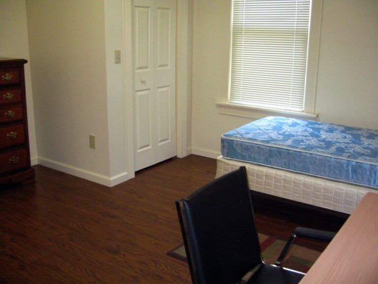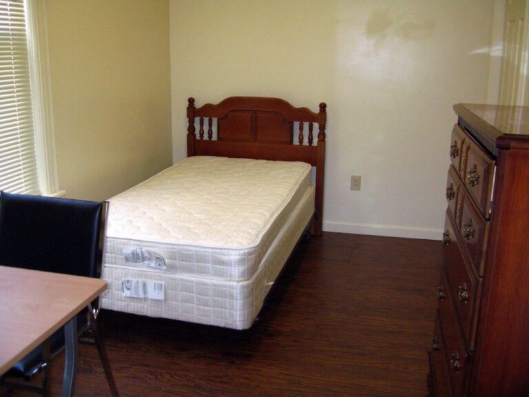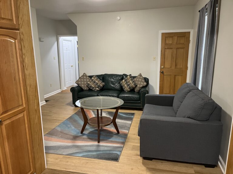 Bedrooms include twin XL bed, chest of drawers, closet or wardrobe. Computer desks/chairs are available upon request. The living room is furnished with a sofa, love seat, chair, end and coffee tables. Kitchen comes with butcher block counter and stools.